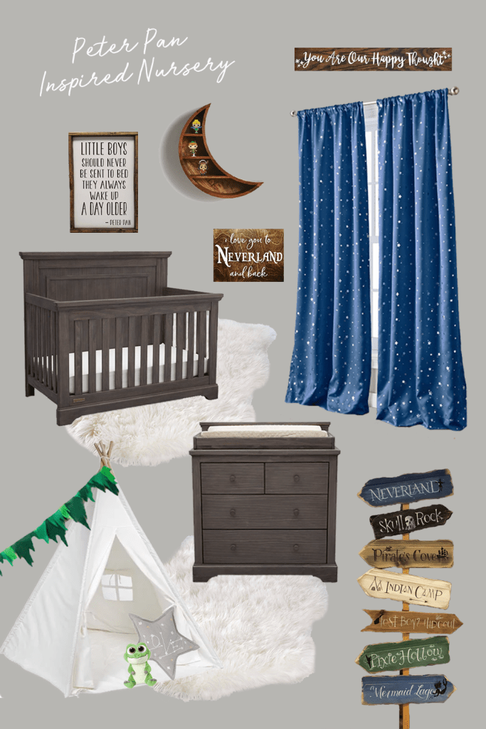 All of this resulted in the mood board below, a nursery designed in neutral wood, white, and grey tones with subtle nods to the heartwarming Disney story of a mischievous young boy who wishes to never grow up and abandon magical childhood adventures.